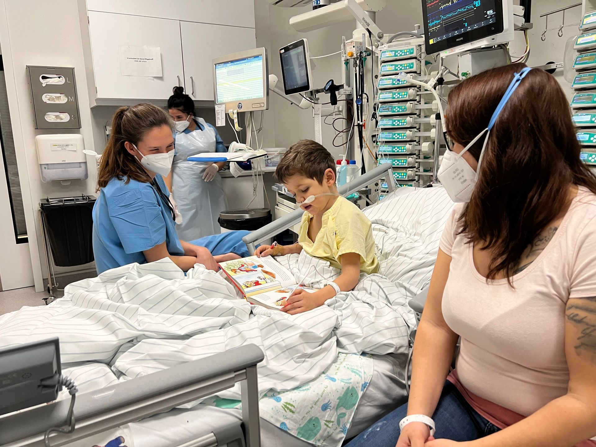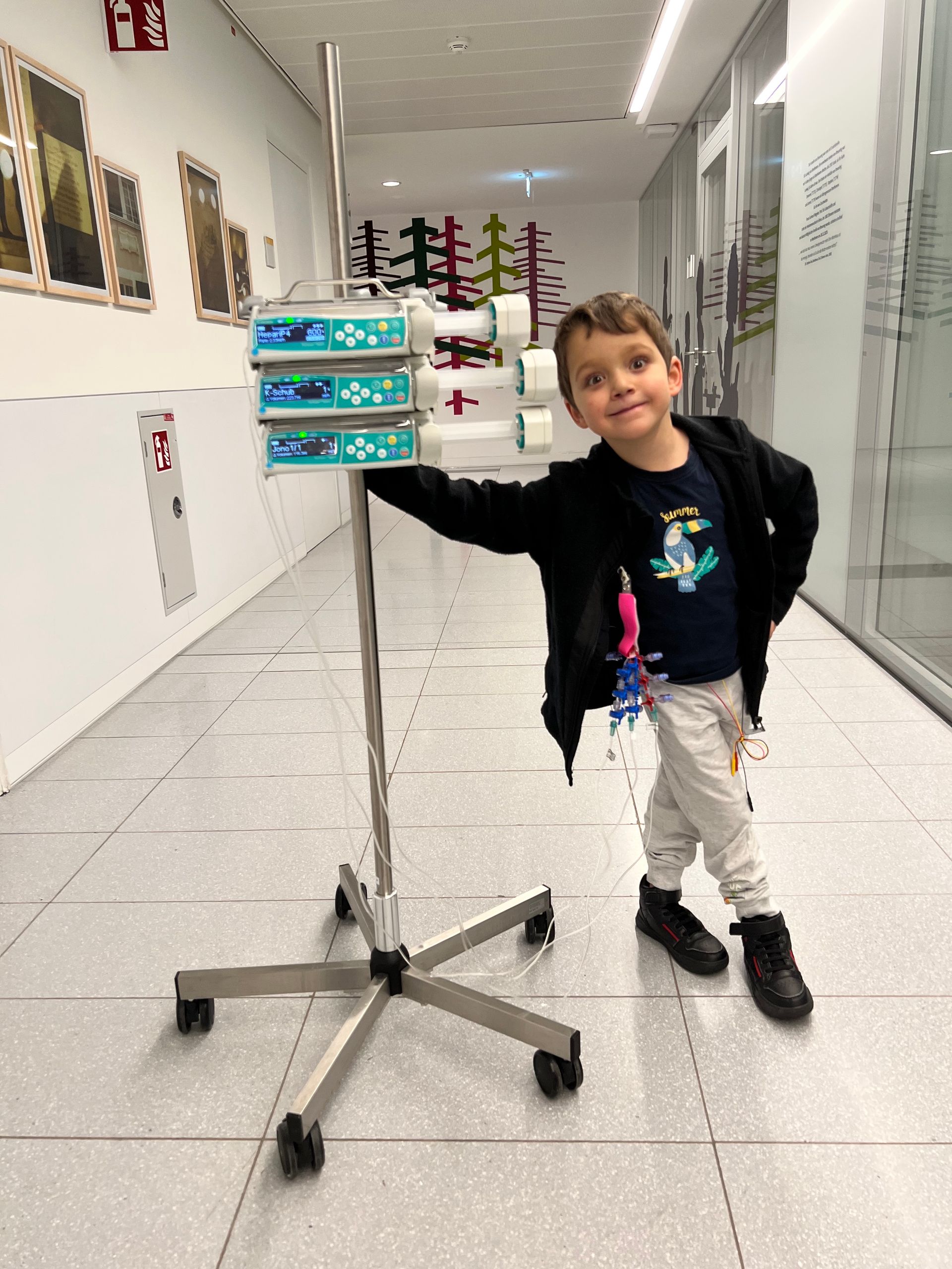 mit unserem 6-jährigen Sohn Emilio und dem Rettungswagen in das Städt. Klinikum Karlsruhe. Da das Klinikum weder über die nötige Kompetenz, noch die Ausstattung verfügt, kardiologische Patienten voll-umfänglich zu behandeln, wurde direkt die Uniklinik Bonn kontaktiert, welche in dieser besagten Nacht den Karlsruher Ärtzen mit Rat und Tat aus der Ferne zur Seite stand. Noch in dieser Nacht wurde entschieden, Emilio in die Uniklinik nach Bonn zu fliegen. Gesagt - Getan...Am nächsten Morgen ging es mit dem Heli über die Landesgrenze nach NRW. Dort angekommen, wurde Emilio aufwendig untersucht. Man hat uns recht schnell zu verstehen gegeben, dass eine Ursachenforschung nicht Prio A hat, sondern die Rythmusschwankungen zwischen einer Herzfrequenz von